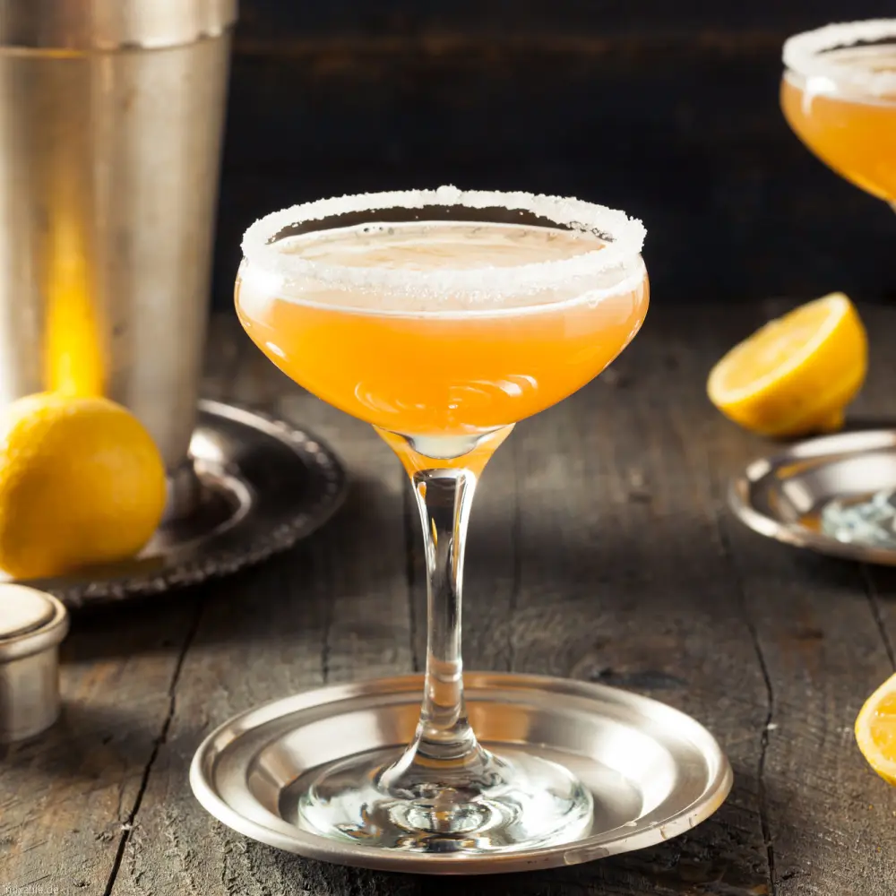 - French School Sidecar CocktailsZutaten: 4 cl Cognac, 2 cl Orangenlikör, Cointreau, 2 cl Zitronensaft
